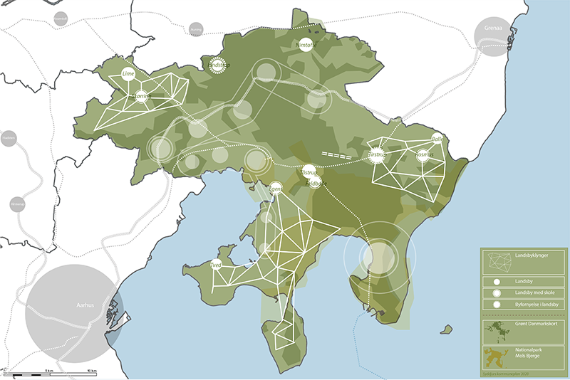 I Syddjurs kommune er der tre landsbyklynger, Ådalen, Mols i udvikling og Østdjurs. De tre landsbyklynger har forbilledlige samarbejder om bosætning, styrkelse af stedsidentitet og indbyrdes balance. Arealudlæggene i kommuneplanen og understøttelse af lokal egenart og søger i videst mulig omfang at støtte op om samarbejderne. Fælles for udvikling i landsbyerne er, at væsentlige ændringer af landsbyafgrænsninger skal ske i dialog med lokalsamfundet.