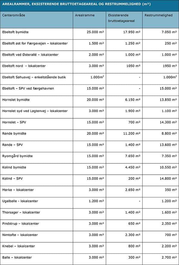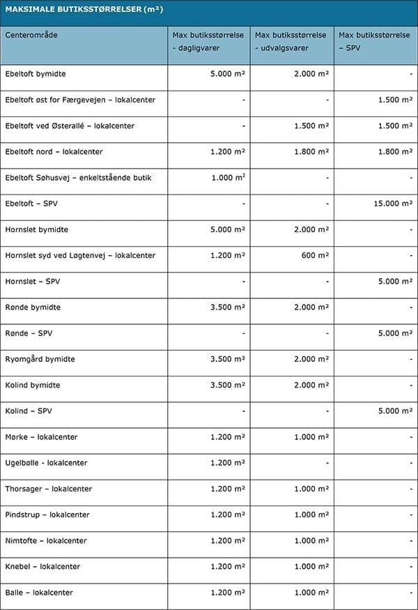 Stk. 6: I Ebeltoft og Hornslet bymidte kan der planlægges for dagligvarebutikker på op til 5.000 m2. og udvalgsvarebutikker på op til 2.000 m². I Rønde, Ryomgård og Kolind bymidter; kan der planlægges for dagligvarebutikker på op til 3.500 m² og udvalgsvarebutikker på op til 2.000 m².